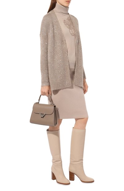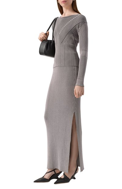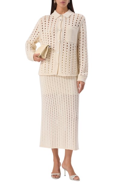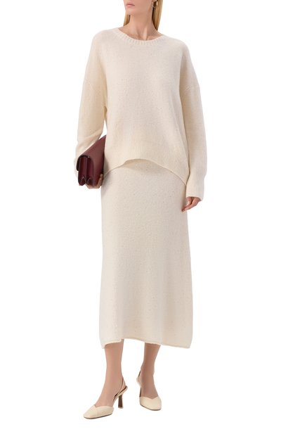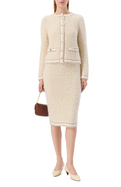 Для изготовления миди-юбки прямого кроя использовали тонкую пряжу с добавлением шерсти и пуха альпака, на которую нанизали микропайетки. Снизу модель с эластичным поясом дополнили кантом в рубчик.