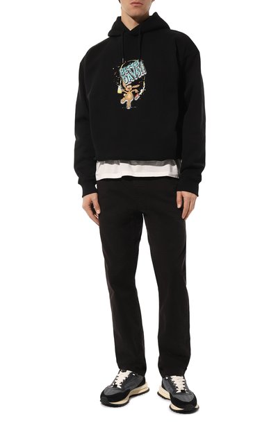 Брюки прямого кроя выполнили из хлопкового вельвета. Модель с эластичным поясом дополнили боковыми и прорезными задними карманами, один из которых украсили брендированной нашивкой.