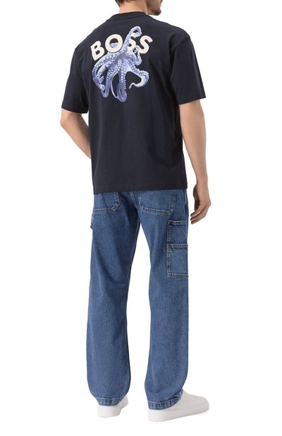 Футболку со спущенной линией п леч выполнили из хлопкового джерси. Модель с круглым вырезом в рубчик украсили логотипом спереди.
