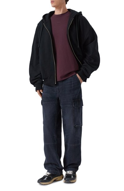 Футболку со спущенной линией плеч выполнили из хлопкового джерси. Модель с круглым вырезом в рубчик украсили логотипом спереди.