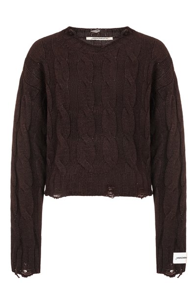 Свитер с объемным арановым мотивом и потертостями выполнили из акриловой пряжи с добавлением шерсти и вискозы. Левый рукав изделия украсили контрастной брендированной нашивкой.