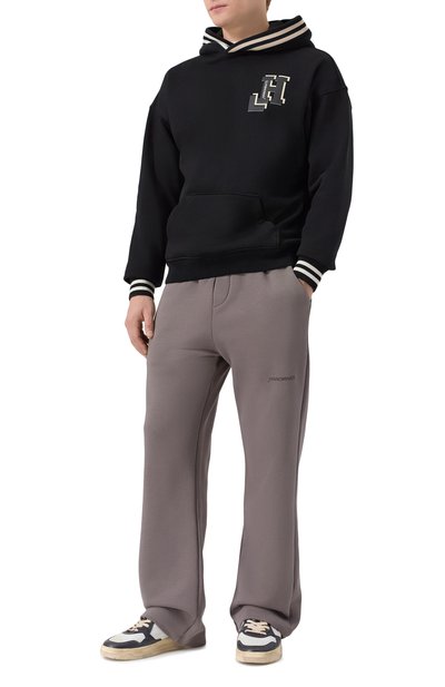 Брюки прямого кроя сшиты из хлопкового трикотажа с добавлением полиэстера. Модель с эластичным поясом-кулиской и тремя карманами украшена логотипом марки сбоку.