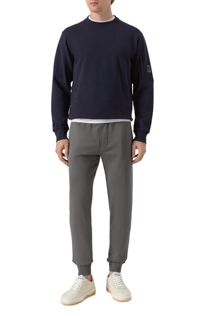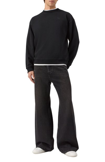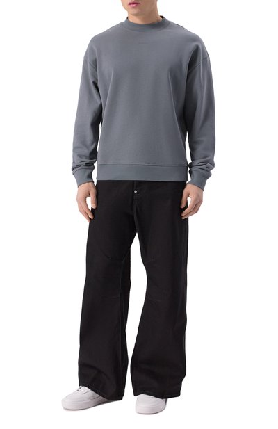 Свитшот со спущенной линией плеч выполнили из хлопкового трикотажа, усиленного полиэстером. Спереди модель с горловиной, поясом и манжетами в рубчик украсили небольшим логотипом в тон.