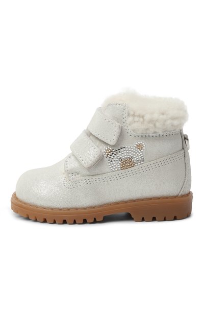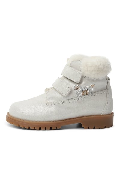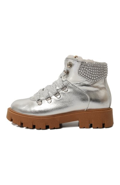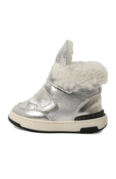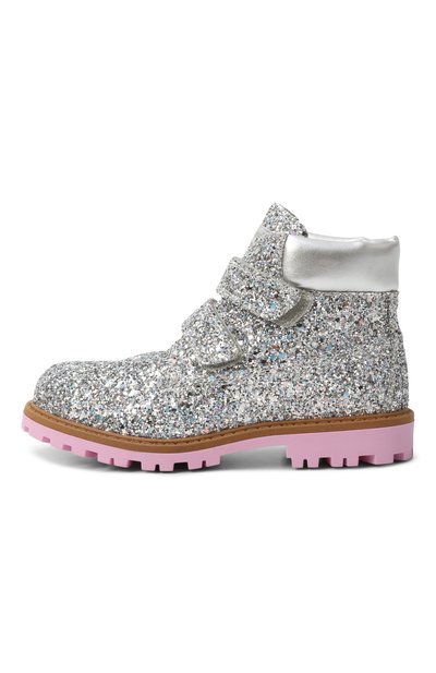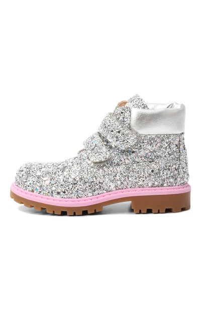 Ботинки с кантом из металлизированной кожи по краю голенища выполнил из текстиля, покрытого серебристым глиттером. Модель на широкой протекторной подошве застегивается двумя ремешками велкро.