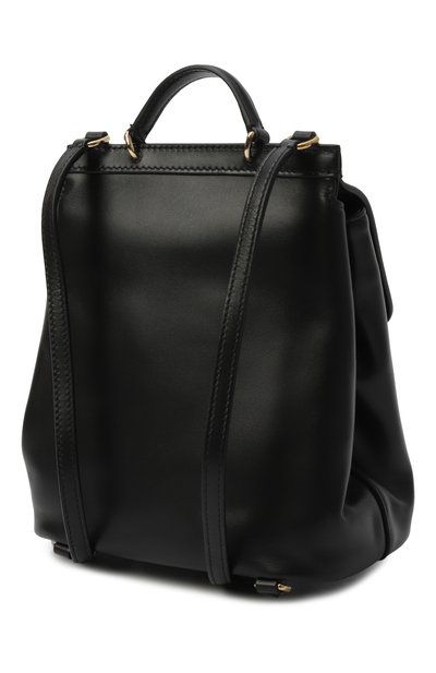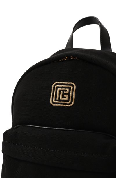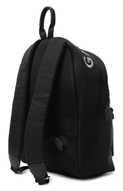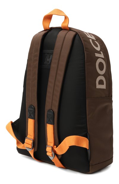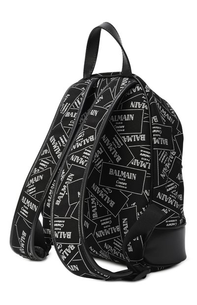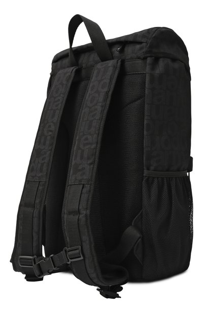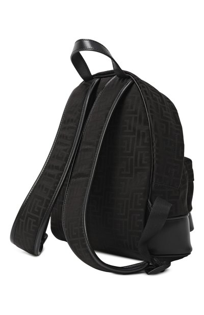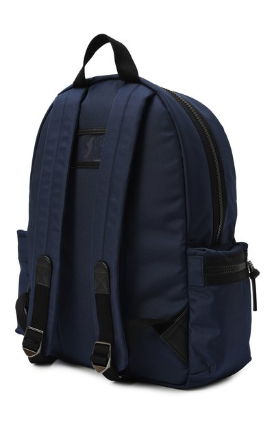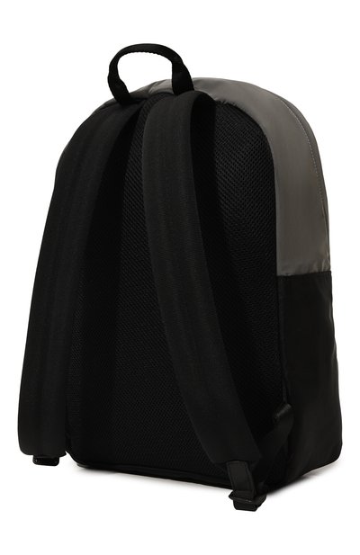 Рюкзак с аппликацией-логотипом сверху выполнили из полиэстерового текстиля. Аксессуар дополнили двумя накладными внешними карманами, один из которых украсили фирменной двухслойной пластиной.
