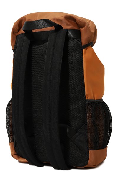 Текстильный рюкзак с сетчатым боковым карманом украсили изображением тигра, дополненным аппликациями в виде ушей и лап. Широкие лямки с регулируемой перемычкой укрепили кожаными накладками.