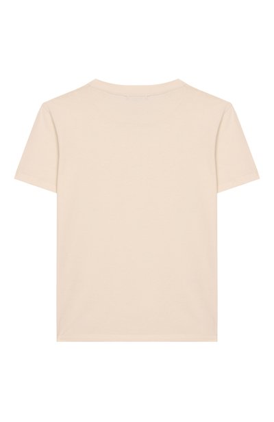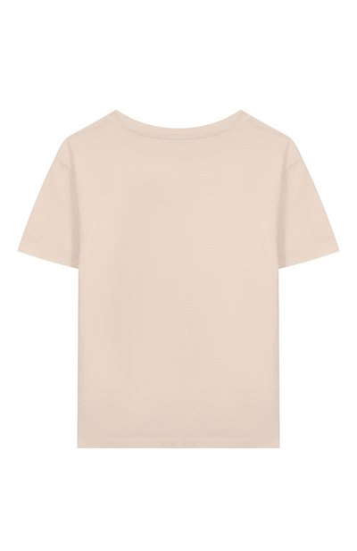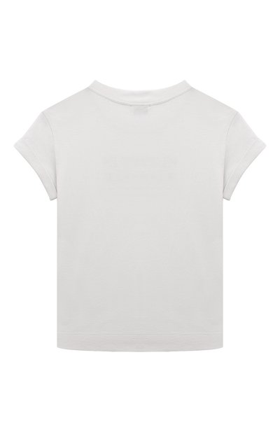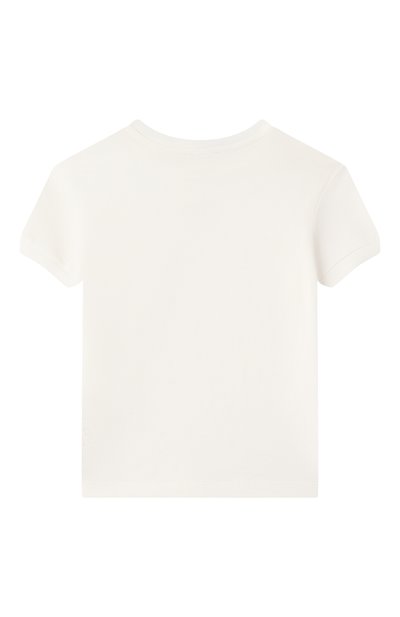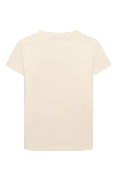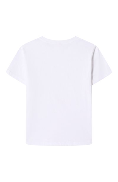 Футболку с вышитым изображением букета ромашек украсили накладкой в виде монограммы DG. Для изготовления модели с круглой горловиной и спущенной линией плеч использовали хлопковое джерси.