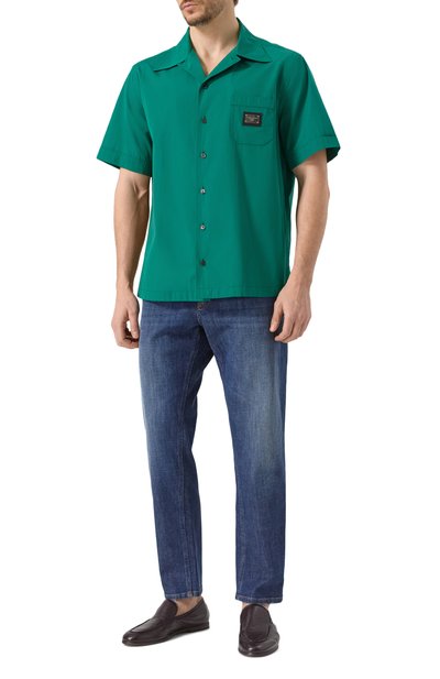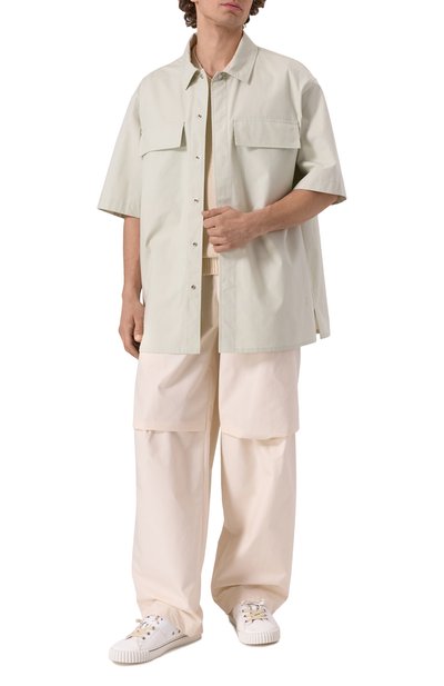 Рубашку кроя Oversized fit выполнили из хлопковой ткани с жаккардовым паттерном в виде фирменной монограммы. Модель со встречной складкой на спинке и кубинским воротником дополнили накладным нагрудным карманом.