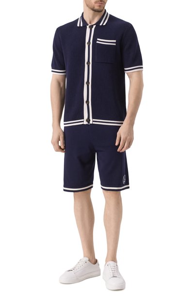 Шорты с эластичным поясом сшили из микса полиэстера, полиамида и хлопка с жаккардовым узором-эмблемой. Модель с двумя боковыми и задним карманами украсили отворотами, в тон которым выполнили отделку и логотип на левой брючине.