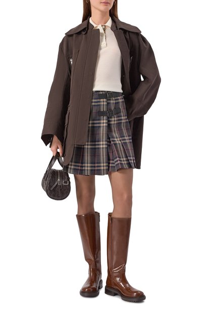 Поло с клетчатым узором связали из буклированного микса хлопка, нейлона и эластана. Пояс, манжеты и отложной воротник модели, украшенной фирменной нашивкой спереди, подчеркнули контрастными полосами. Изделие застегивается пуговицами-кабошонами.