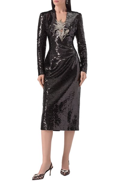 Полностью покрытое пайетками платье со шлицей украсили тремя бисерными бантами, расположив их под фигурным вырезом. Приталенная модель из микса полиэстера и шелка застегивается потайной молнией сзади.