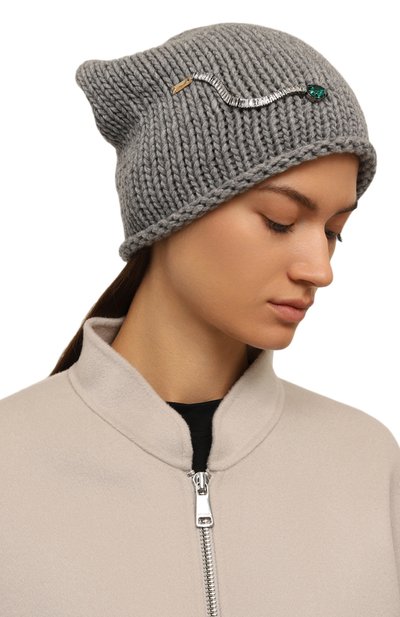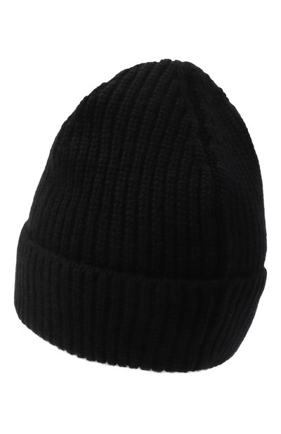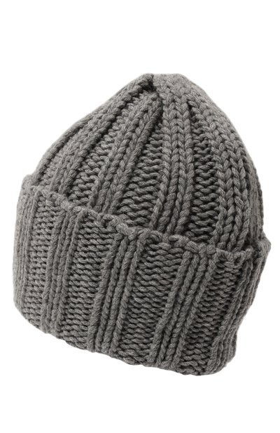 Шапку бини в рубчик выполнили из меланжевой шерстяной пряжи с добавлением кашемира. Широкий отворот аксессуара украсили вышитым логотипом бренда.