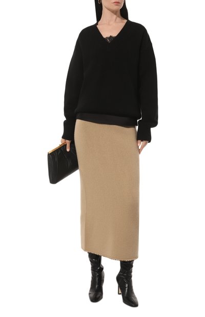 Юбка-карандаш с высоким разрезом и широким поясом выполнена из шерстяного трикотажа. Эластичная модель без декора легко впишется в базовый гардероб.