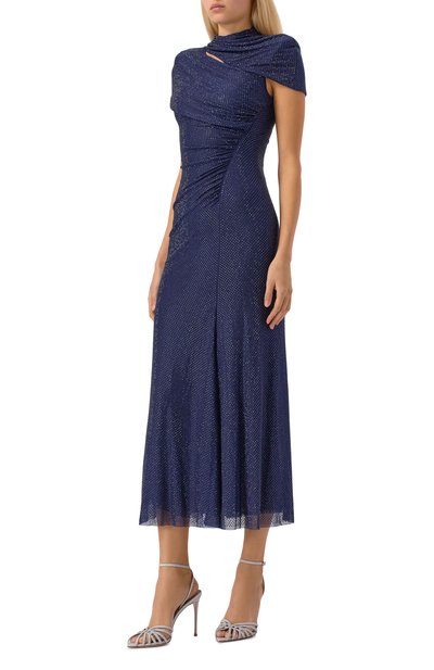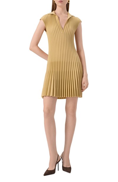 Короткое платье без рукавов выполнили из тонкого шерстяного трикотажа с фактурным узором, имитирующим плиссировку. Модель с глубоким V-образным вырезом дополнили воротником-поло.