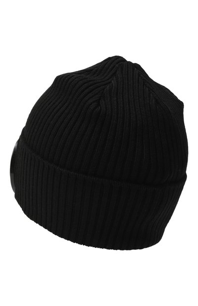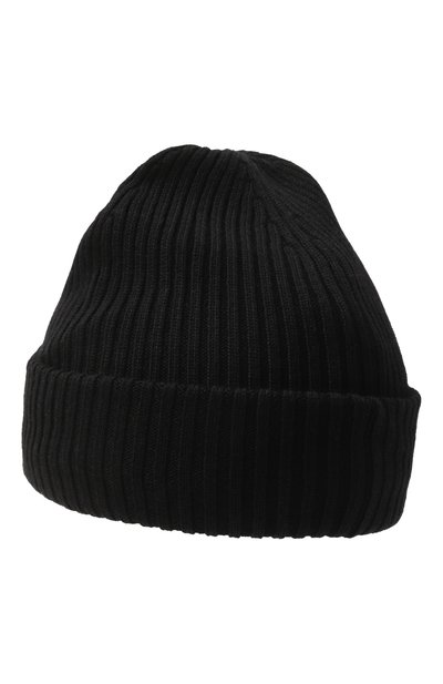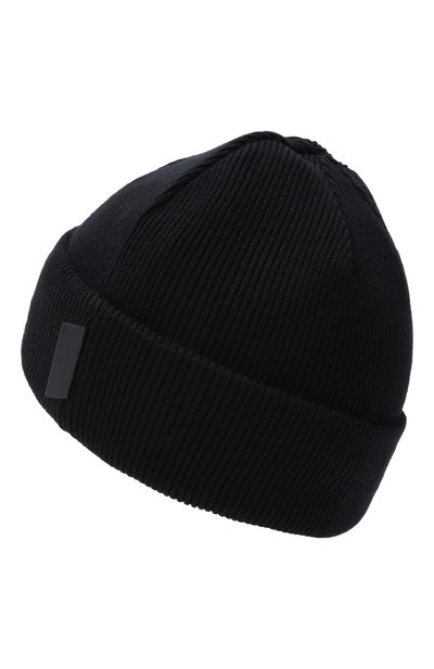 Шапка бини выполнена из шерстяного трикотажа в рубчик. Широкий отворот эластичного аксессуара украшен небольшим текстильным патчем с логотипом марки.