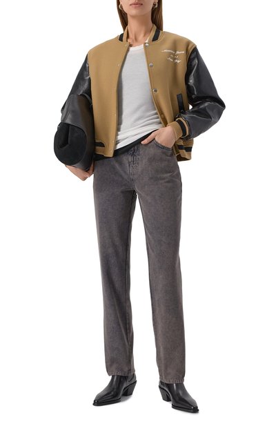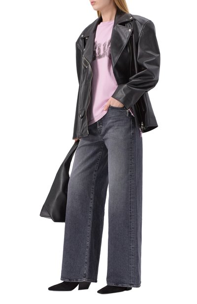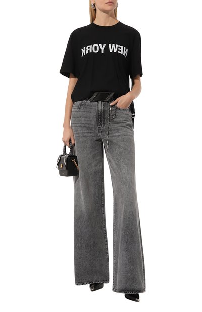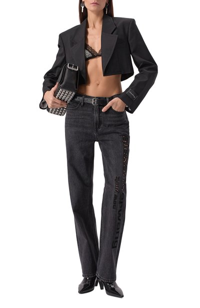 Джинсы с низкой посадкой сшили из хлопкового денима. Самый маленький из пяти карманов украсили ярлыком с эмблемой марки, а пояс – брендированным кожаным патчем.