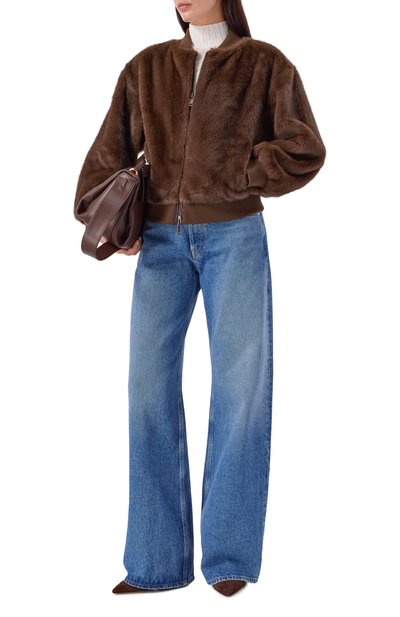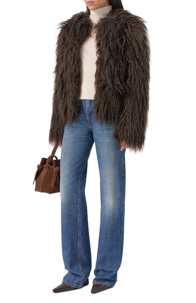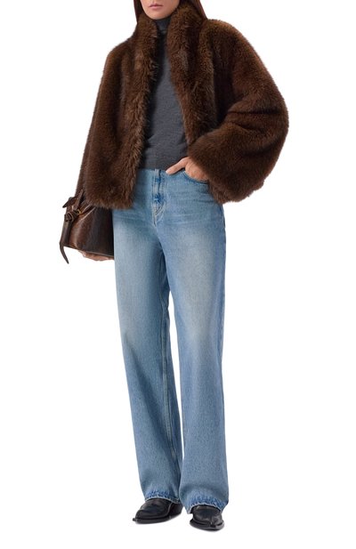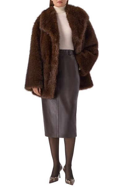 Шубу с широкими лацканами и отложным воротником дополнили карманами по бокам. Укороченная модель из искусственного меха, напоминающего норковый, застегивается потайным крючком.