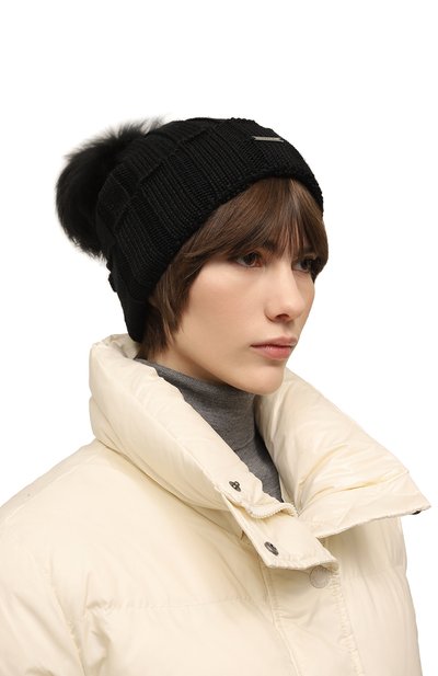 Балаклаву с кулиской вдоль выреза для лица связали английской резинкой из шерстяной пряжи с добавлением кашемира. Спереди модель украсили брендированной рельефной нашивкой в тон.