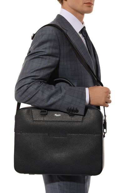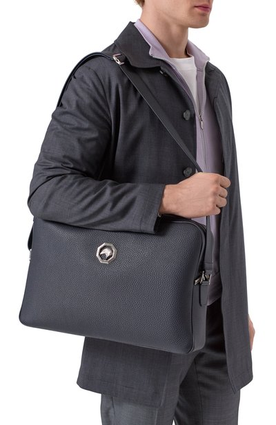 Для изготовления портфеля с двумя ручками и съемным плечевым ремнем использовали сафьяновую кожу. Внешний и внутренний карманы, как и сам аксессуар, застегиваются молниями с брендированными круглыми пуллерами.