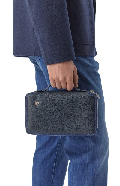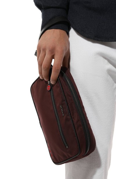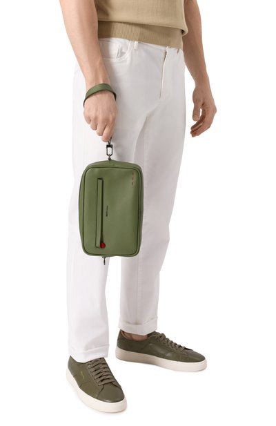 Борсетку со съемной ручкой-петлей выполнили из сафьяновой кожи. Спереди изделие украсили логотипом марки и тремя стежками фирменного алого оттенка. Сама модель, как и внешний карман, застегивается молнией.