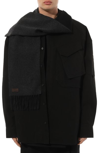 Широкий шарф выполнили из чистого кашемира. Аксессуар с бахромой на концах декорировали кожаным патчем с тисненым логотипом.