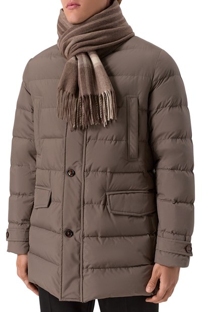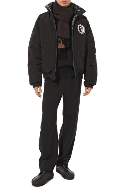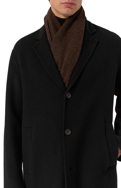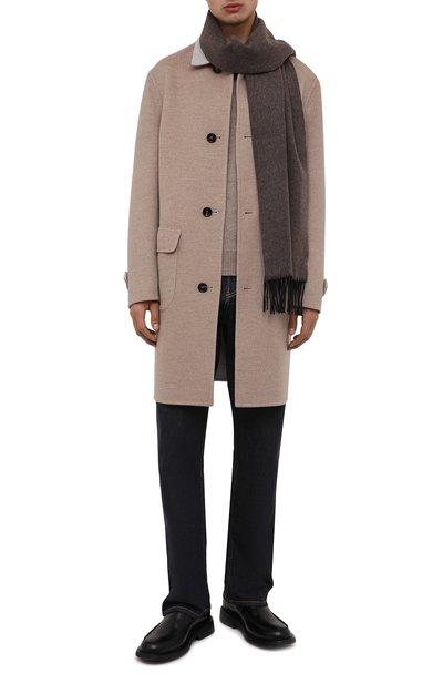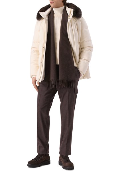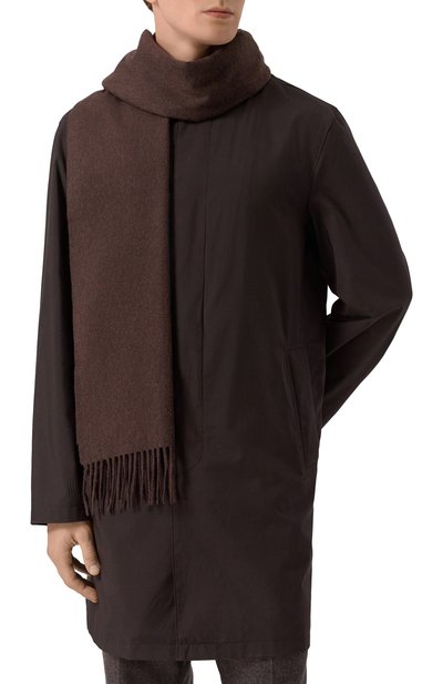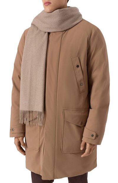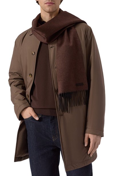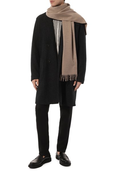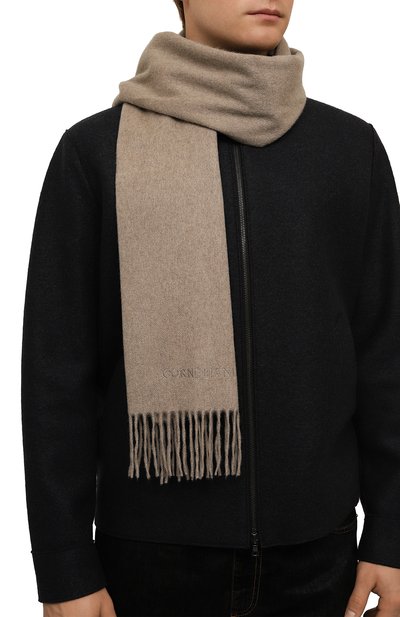 Для изготовления широкого шарфа использовали чистый кашемир с ворсистой фактурой. Аксессуар с бахромой на концах декорировали кожаным патчем с тисненым логотипом марки.