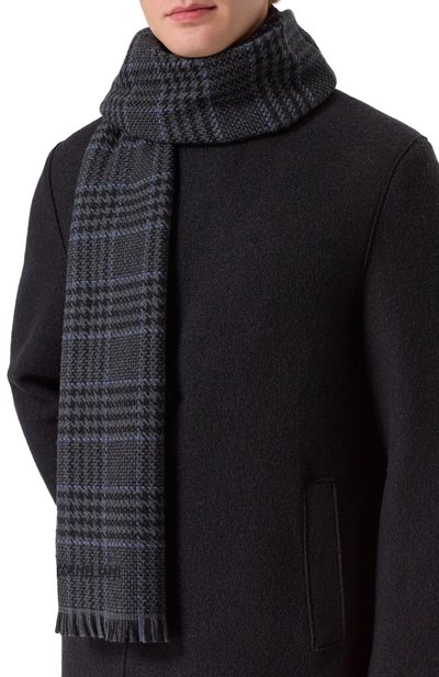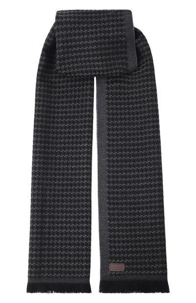 Шарф из шерсти с жаккардовым геометрическим узором отделан по краям короткой бахромой. Аксессуар, длины которого хватит, чтобы несколько раз обернуть вокруг шеи, украшен брендированным патчем.