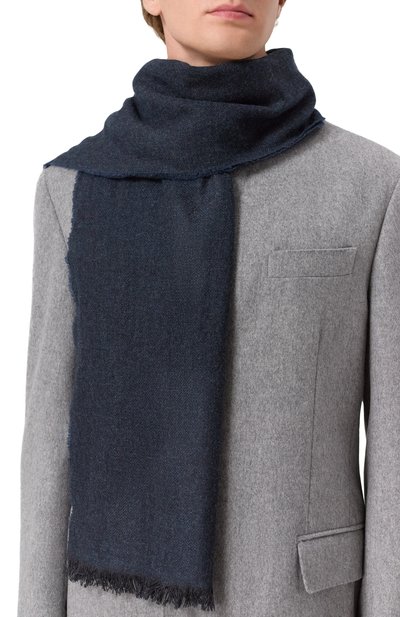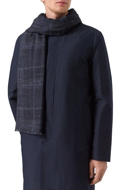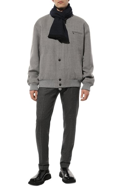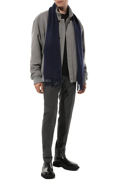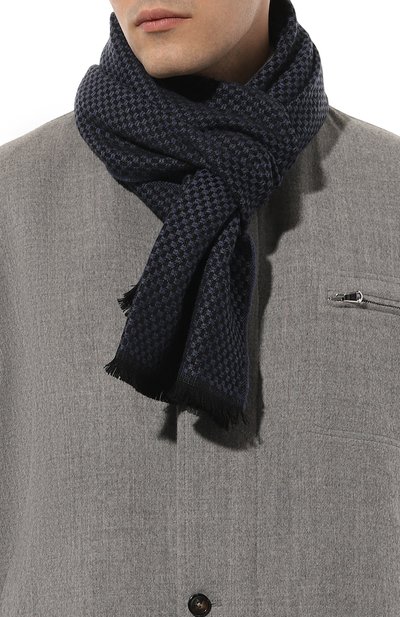 Шарф, длины которого хватит, чтобы завязать объемный узел, выполнен из шерсти с жаккардовым узором. Широкий аксессуар с короткой бахромой по краям украшен брендированным патчем.
