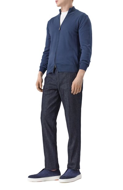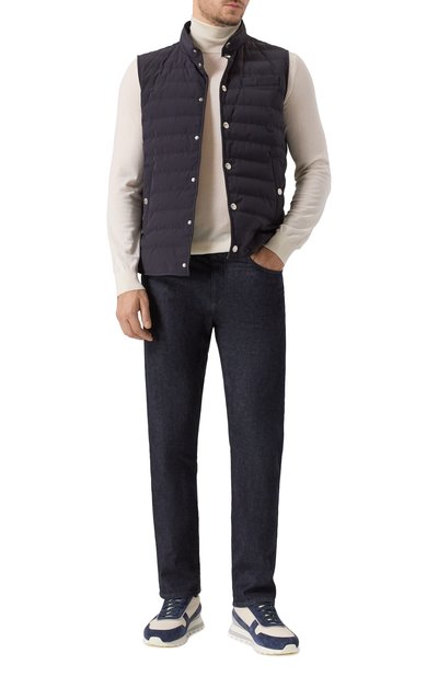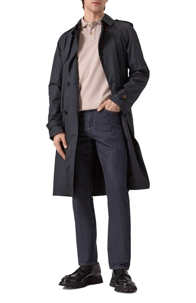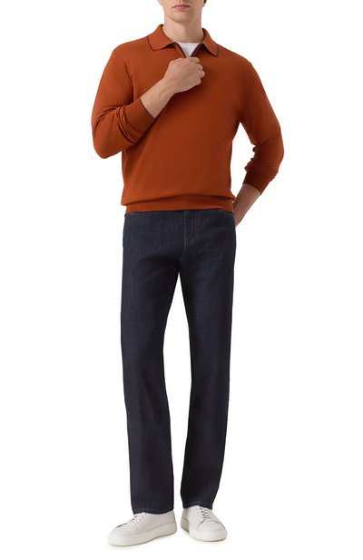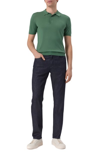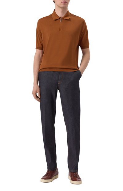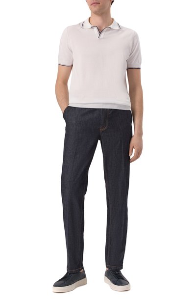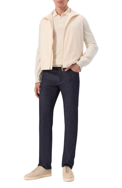 Джинсы прямого кроя выполнили из эластичного денима с добавлением лиоцелла и полиэстера. Модель с пятью карманами украсили полосатой лентой сбоку и замшевым брендированным патчем сзади.