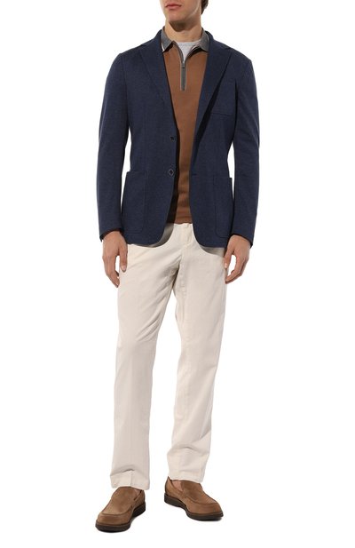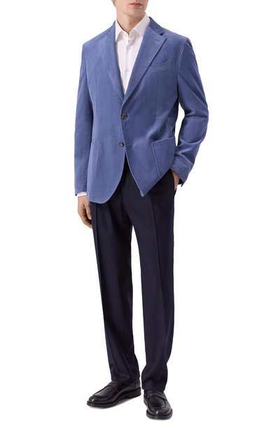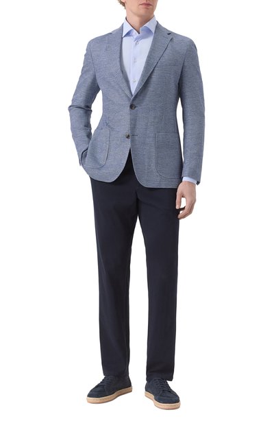 Блейзер в мелкую клетку выполнили из хлопкового трикотажа. Модель с прямоугольными манжетами и парой шлиц сзади дополнили тремя накладными карманами.