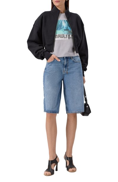 Частично выбеленную толстовку с капюшоном и двумя боковыми карманами выполнили из хлопкового трикотажа. Спереди модель декорировали фирменной эмблемой.