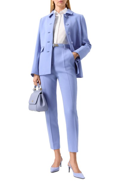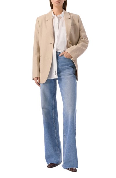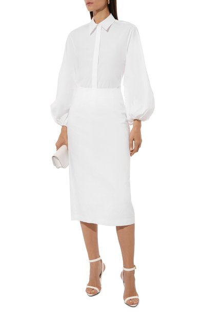 Рубашку с фигурным низом и бантовой складкой на спинке выполнили из хлопкового поплина. Модель с перламутровыми пуговицами украсили брендированными вставками на прямоугольных манжетах.