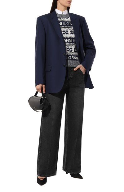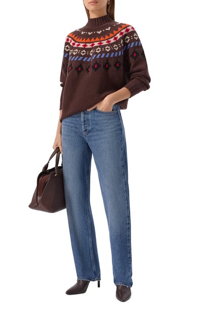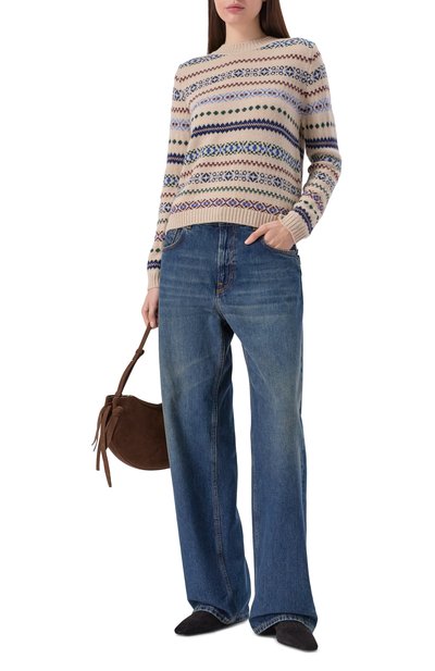 Свитер с брендированным жаккардовым узо ром связали из микса шерсти и кашемира. Модель дополнили круглой горловиной, широким поясом и манжетами в рубчик.