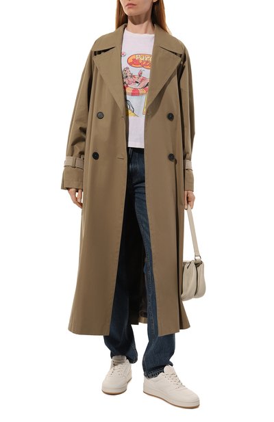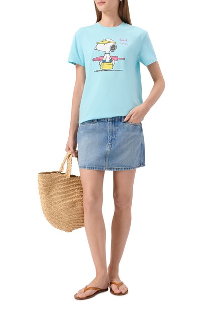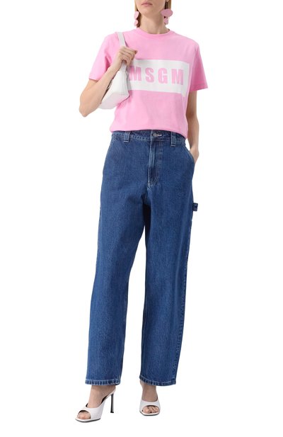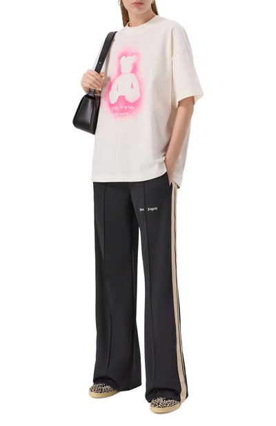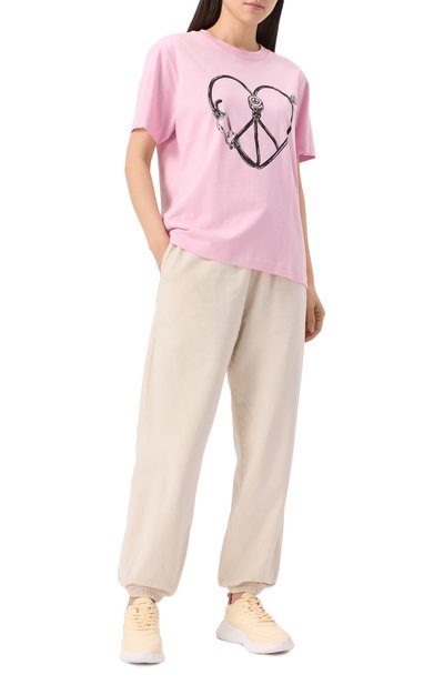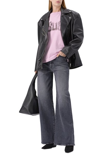 Футболку свободного кроя выполнили из хлопкового джерси. Спереди выбеленную модель декорировали крупным брендированным принтом, дополненным прозрачными стразами.