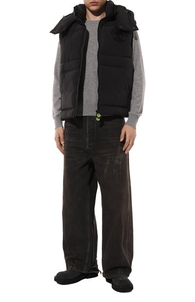 Жилет с широким поясом, проймами и круглым вырезом в рубчик связали из микса акрила и шерсти. Модель украсили неоновой полоской спереди и брендированным патчем сзади.
