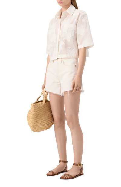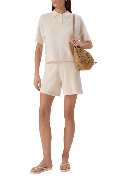 Шорты с высокой посадкой и широким поясом-кулиской сшили из махрового хлопка. Эластичную модель из коллаборации с Hotel du Cap-Eden-Roc дополнили накладным и двумя врезными карманами.
