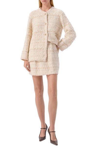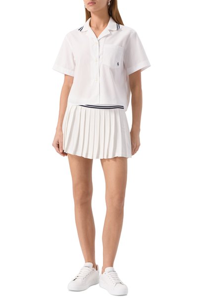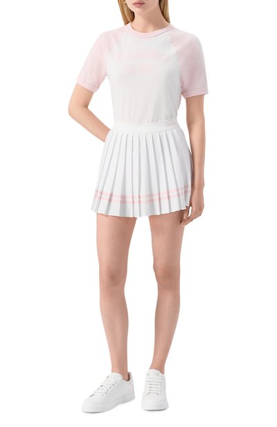 Юбку Mila из коллекции Sporty & Rich x Hotel du Cap-Eden-Roc украсили вышитой фирменной символикой обоих брендов. Короткая модель из джерси, украшенная полосами в тон декора, застегивается сзади потайной молнией.