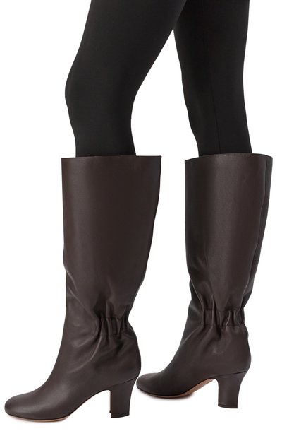 Сапоги Dakota на устойчивом каблуке средней высоты выполнили из зернистой телячьей кожи, сертифицированной по стандарту LWG. Задник и треугольную вставку на прямом голенище подчеркнули ремешками с пряжками Paddington. Готовую пару без застежки обработали щетками, создав декоративные потертости.