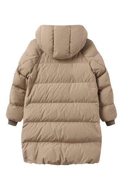 Для пошива стеганой куртки, утепленной гусиными пухом и пером, использовали влагостойкую тафту из полиэстера и хлопка. Модель с отложным воротником и съемным капюшоном застегивается кнопками. Один из нагрудных карманов украшен фирменными цепочками мониль.