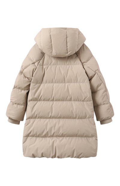 Пуховик из влагоотталкивающей тафты на основе полиэстера и хлопка дополнили нагрудными карманами, украсив левый фирменной цепочкой мониль. Модель со съемным капюшоном и контрастными кнопками утеплили гусиным пухом и пером.