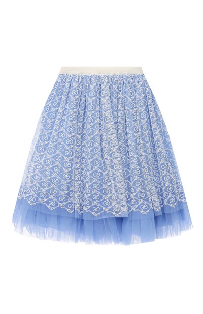 Юбку из нейлонового тюля украсили геометрическим узором, вышитым пайетками. Расклешенную модель на подкладе дополнили поясом из стрейчевой ленты с серебристым кантом.