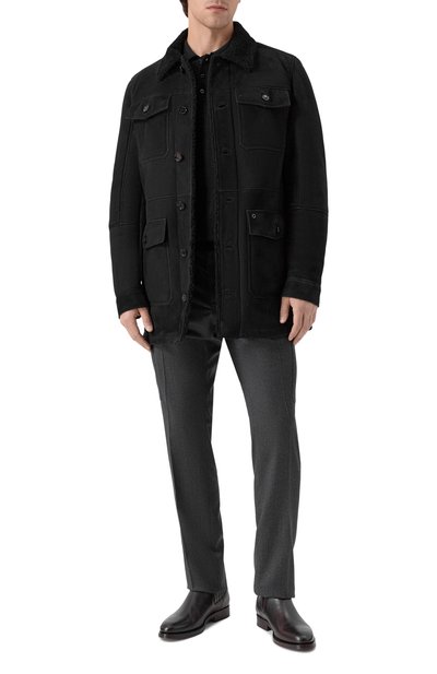 Дубленку с боковыми карманами сшили из овчины с плотным ворсом внутри. Модель с кашемировыми рифлеными манжетами, поясом и вставкой на воротнике, дополненной меховой отделкой, застегивается встречной молнией.