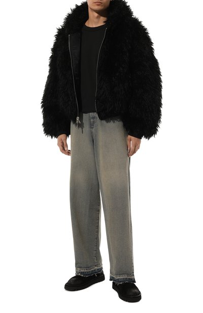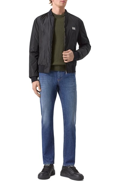 Нейлоновый стеганый бомбер дополнили воротником, манжетами и поясом из эластичного трикотажа в рубчик. У изделия предусмотрели боковые карманы с клапанами и нарукавный на молнии. Сзади модель украсили патчем с фирменной двухслойной пластиной.