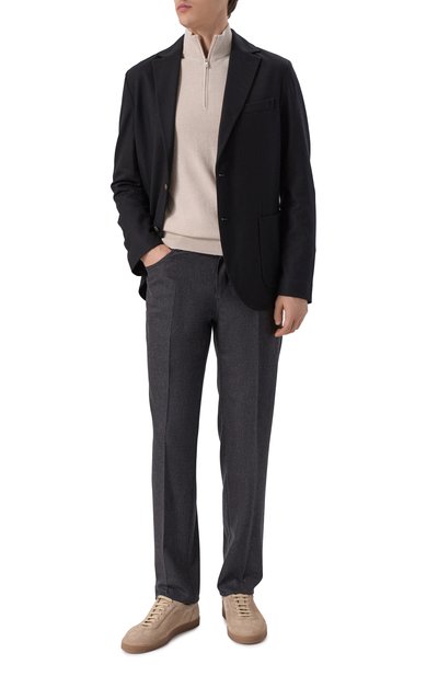 Однобортный пиджак с двумя шлицами выполнили из стрейчевого материала на основе полиэстера и шерсти. Модель с блестящими брендированными пуговицами дополнили парой накладных карманов.