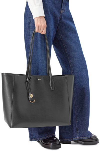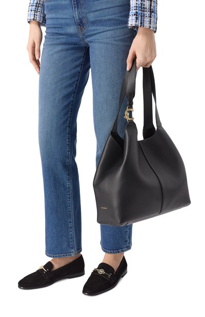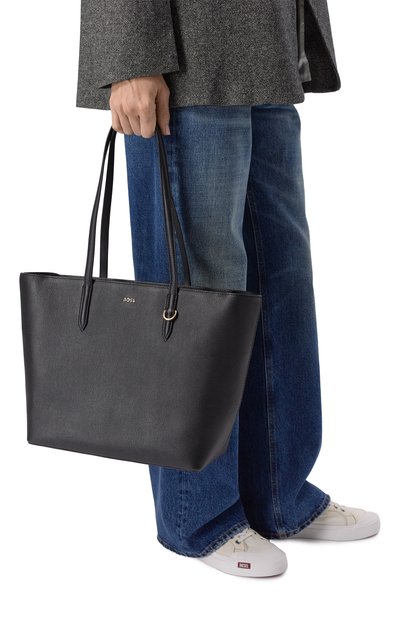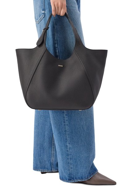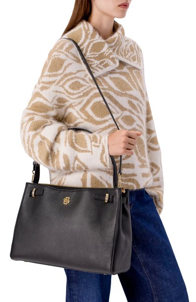 Сумку Lenah с двумя ручками выполнили из зернистой яловой кожи. Внутри модель с застежкой на ремешок с карабином дополнили двумя карманами: на молнии и плоским накладным.
