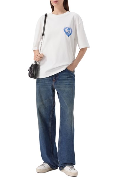 Футболку с круглой горловиной в рубчик украсили каллиграфическим логотипом, выложенным стразами. Для изготовления модели использовали хлопковое джерси.