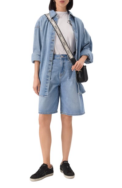 Для пошива футболки с круглым вырезом использовали хлопковое джерси. Модель прямого кроя украсили спереди брендированным принтом в виде бокала с кристальными пузырьками.