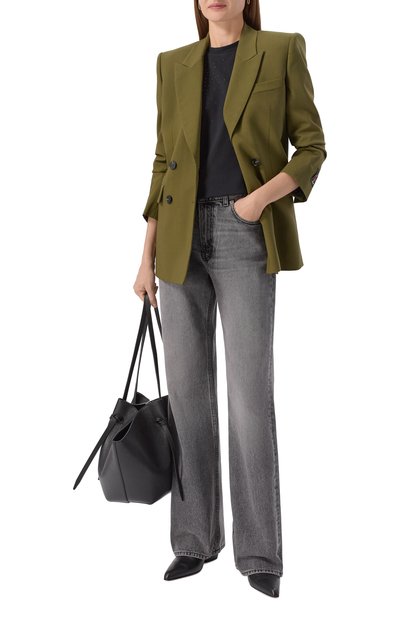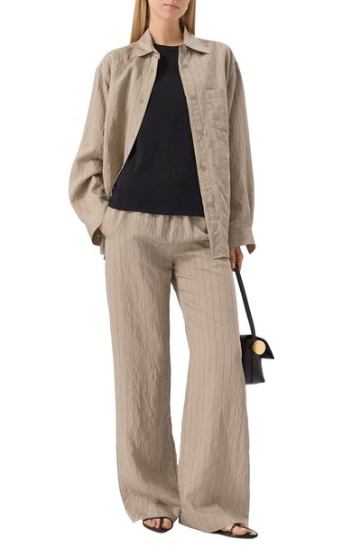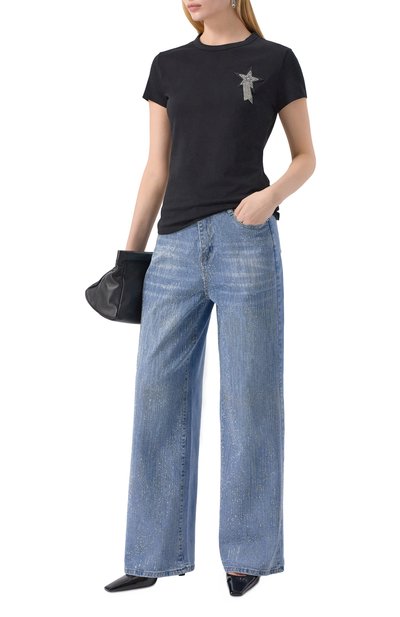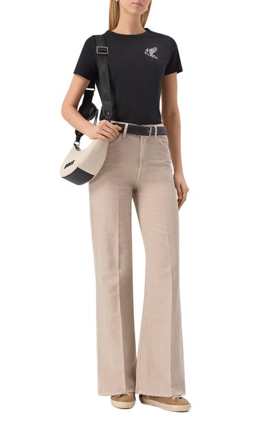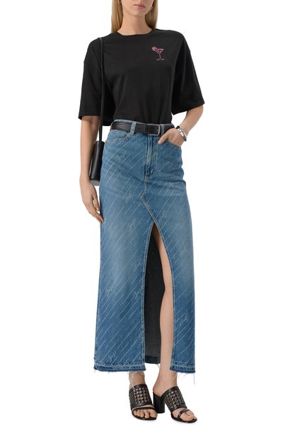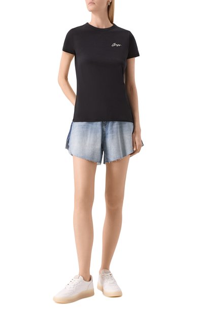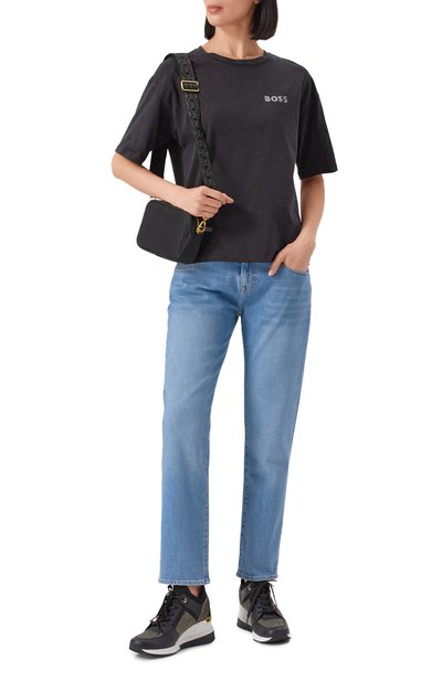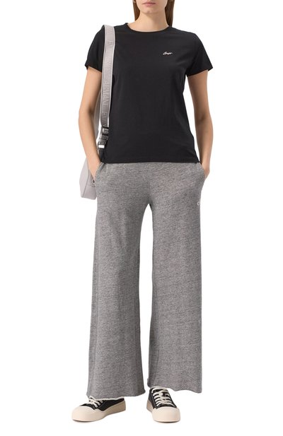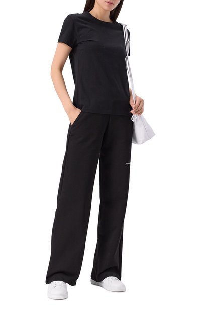 Для пошива футболки с круглым вырезом использовали хлопковое джерси. Спереди модель прямого кроя украсили брендированным текстовым принтом.