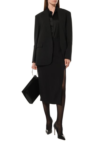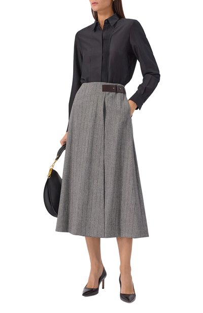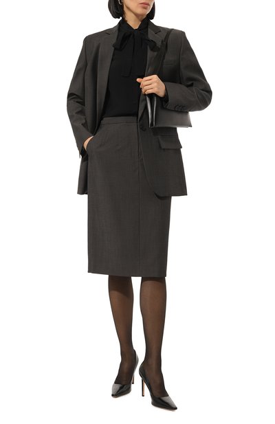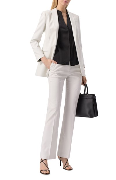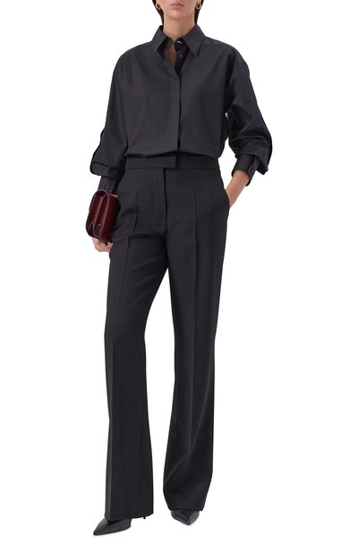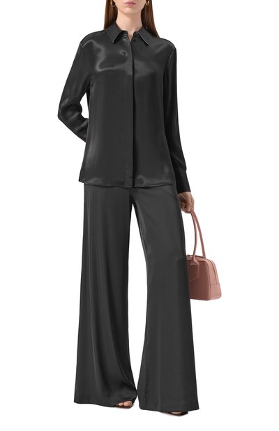Для изготовления блузы прямого кроя использовали тонкий шелк. Модель с супатной застежкой, скошенными манжетами и боковыми разрезами дополнили длинными лентами на воротнике-стойке.