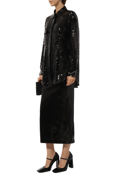Для пошива блузки свободного кроя использовали струящуюся вискозу с леопардовым принтом. Манжеты длинных рукавов застегиваются кнопками-логотипами марки, а сама модель – пуговицами.